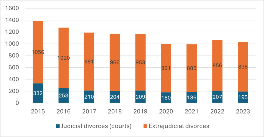 Data were requested from the Portuguese National Statistical Institute (INE). Divorces are classified as either extrajudicial (handled by civil registry offices) or judicial (processed through the courts).