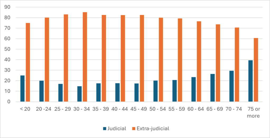 Figure 4 Percentage Distribution of judicial and extra-judicial divorces by age of one spouse – Portugal, 2022