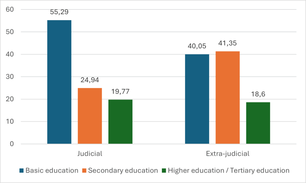 Figure 5 Percentage distribution of judicial and extra-judicial divorces by education of one spouse, Portugal 2022
